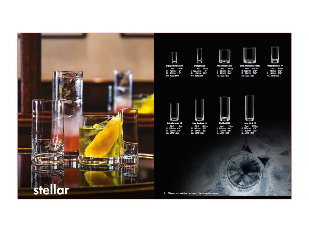 Schopnosť ponúknuť klasickú sadu valcovitých odlievok je pre každého seriózneho výrobcu skla pre gastro segment povinnosťou. Rona ponúka populárnu sadu Stellar, spolu s oblejším tvarom Lunar. Stellar je vyrobený s plochým dnom, v ktorom sa neudržiava voda po umytí.