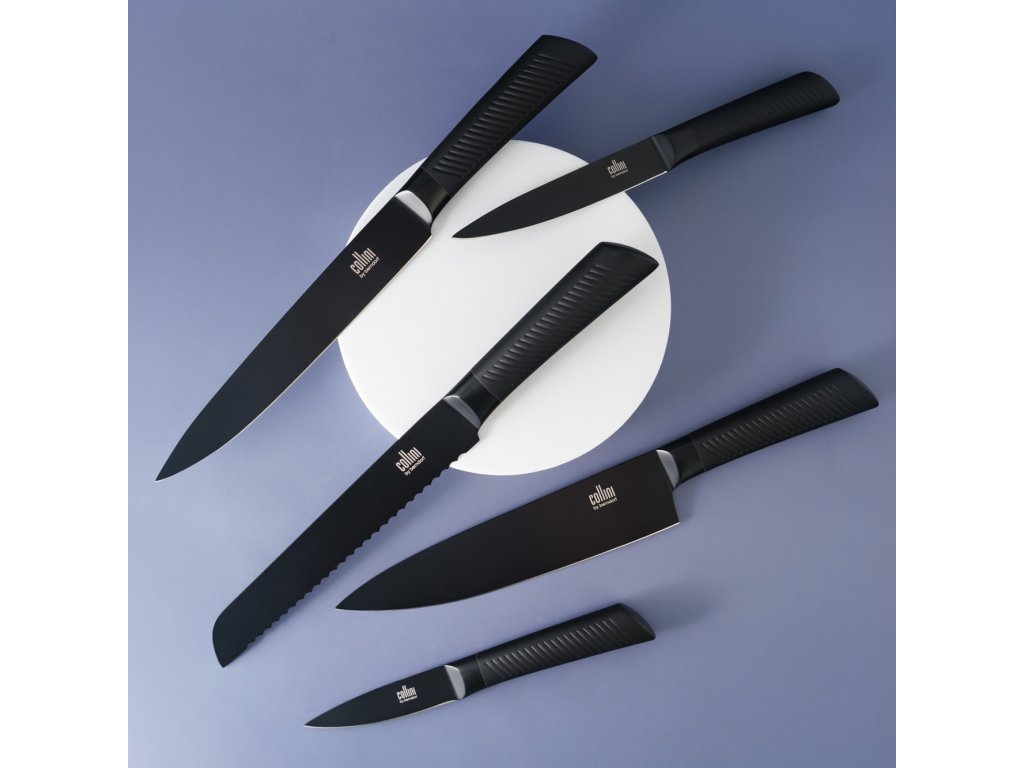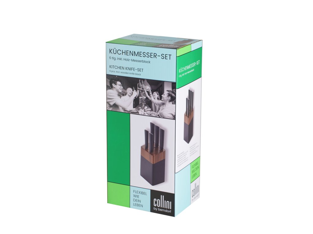 Šesťdielny kuchynský set Collini by Berndorf je spoľahlivým základom každej modernej kuchyne. Obsahuje 5 kvalitných nožov vyrobených z odolnej nehrdzavejúcej ocele a elegantný drevený blok, ktorý poskytuje bezpečné a štýlové uloženie.