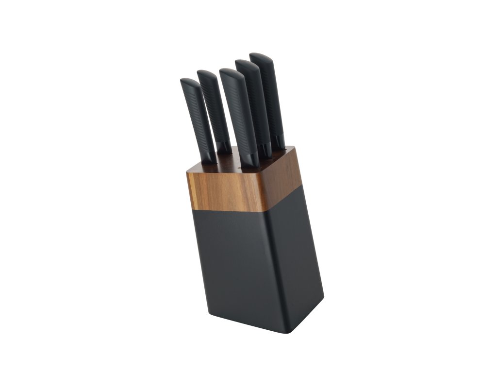 Každý nôž je navrhnutý tak, aby spĺňal každodenné potreby varenia – od krájania chleba až po precíznu prácu s ovocím a zeleninou. Čierne ergonomické rukoväte zabezpečujú pohodlný úchop a moderný vzhľad, zatiaľ čo robustný drevený blok prináša do kuchyne teplo prírodného materiálu a praktickosť pri skladovaní.
