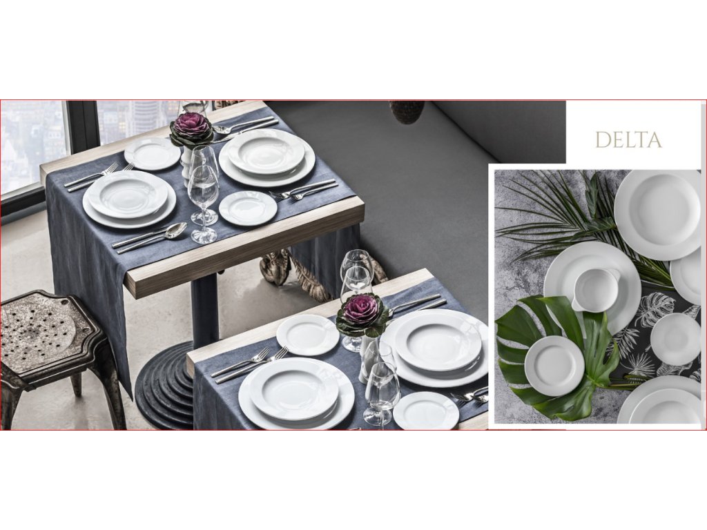 Kolekcia Delta je určená pre tých, ktorí uprednostňujú jednoduchú eleganciu. Uspokojí oči vašich hostí svojou prezentáciou jedla, ktoré vyzerá na bielom podklade ako umelecké dielo. Model Delta je obľúbený v HoReCa segmente vďaka svojmu jednoduchému a elegantnému dizajnu, ktorý sa dokáže prispôsobiť rôznym interiérovým dekoráciám.