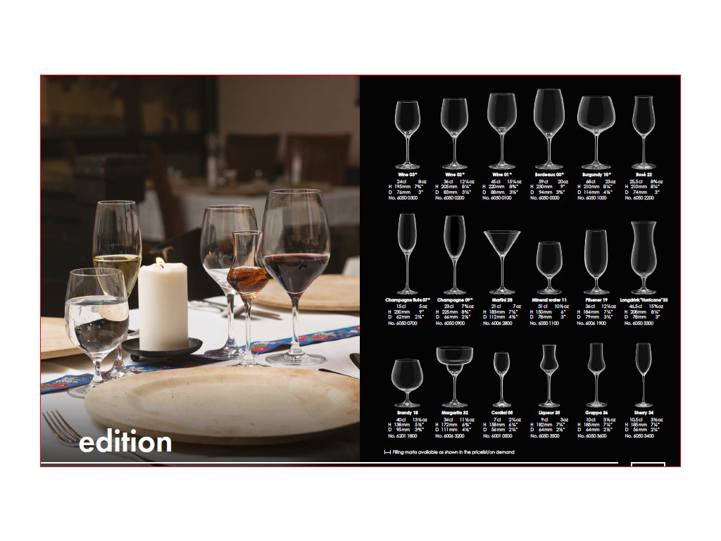 Edition zhŕňa všetky najlepšie vlastnosti profesionálneho skla Rona. Tento klasický dizajn je vhodný pre použitie do každého zariadenia a na rôzne príležitosti. Rada Edition ponúka typické sklo pre akýkoľvek nápoj, vrátane populárneho pohára Hurricane na miešané nápoje alebo Prosecco kalich na šumivé vína. Edition je tou pravou voľbou pre zariadenia, ktoré ponúkajú viac služieb a potrebujú sa spoľahnúť na svoje sklo pri každej príležitosti.